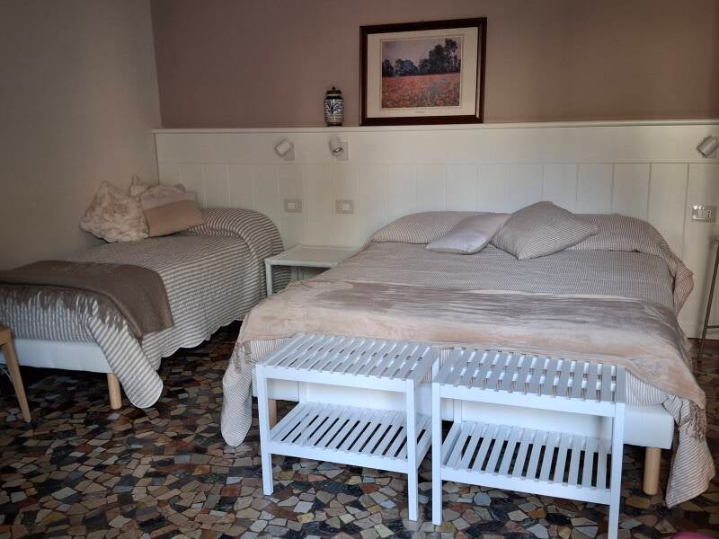 Camera da letto spaziosa , con vista sul giardino. Letto matrimoniale più letto singolo, possibilità di inserire lettino per bimbi fino a 3 anni di età.
